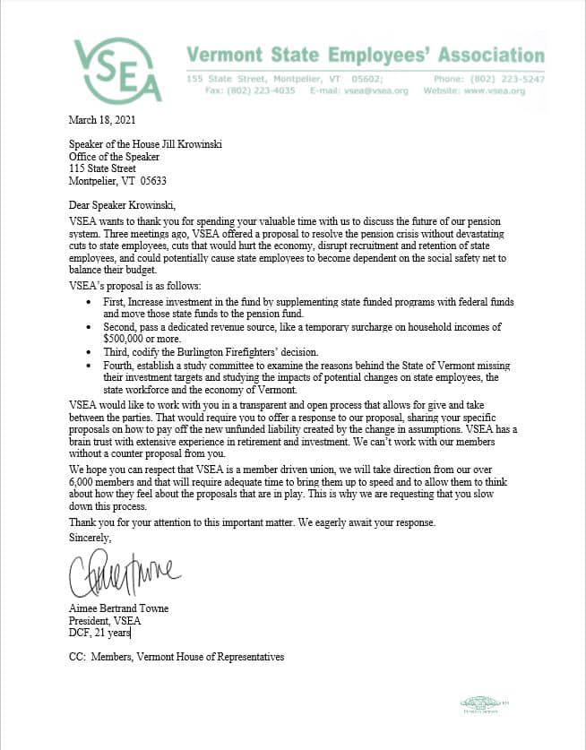 The Vermont State Employees’ Association (VSEA) is today calling on House Speaker Jill Krowinski and the members of the Vermont House of Representatives to immediately schedule a public hearing, when and if any plan is formally introduced in the House to make changes to the state employees’ pension plan.