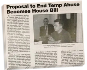 There has not been much justice at all for temps since this story appeared in a 1993 VSEA VOICE,but the fight to reclassify hundreds of misclassified State of Vermont employees is being renewed today by a working group of current temps. VSEA members are encouraged to pass the group’s contact information on to temps where you work. Contact info is SVTEAlliance@gmail.com.