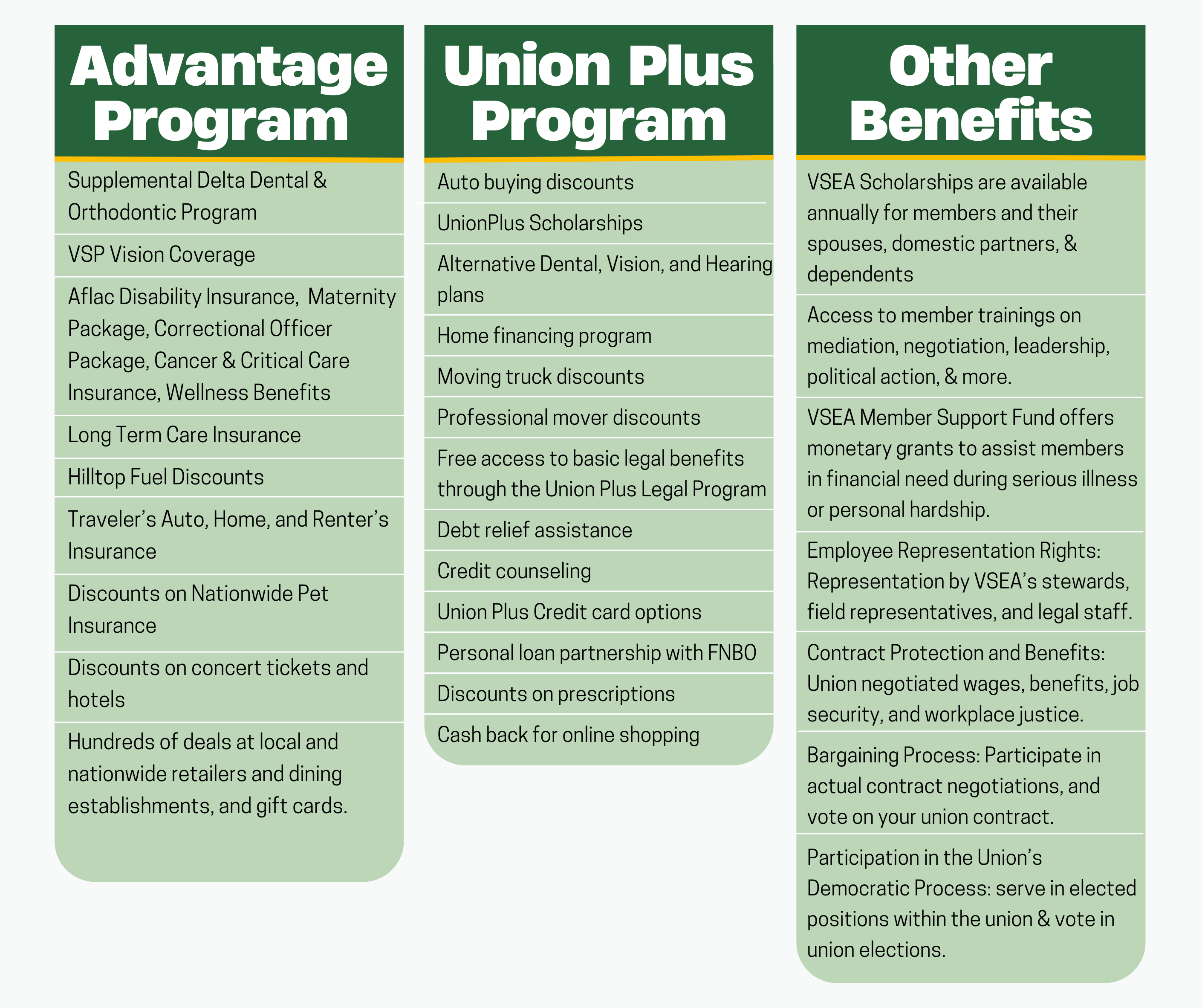 VSEA members have access to our Advantage Program, Union Plus, and other benefits as union members. The table below outlines just some of the benefits available through these programs to members. Some benefits external to the program are shared with members through our monthly newsletter, others can be accessed directly through our website.