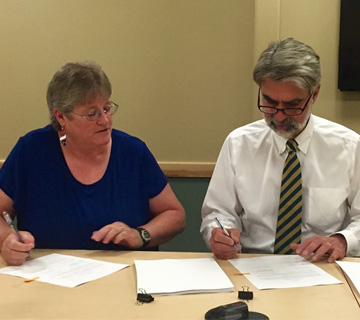 VSEA Vermont State Colleges’ Staff Federation Chair Sandy Noyes and Chancellor Jeb Spaulding officially signed a new contract on August 9 that will govern the workers for the next four years.