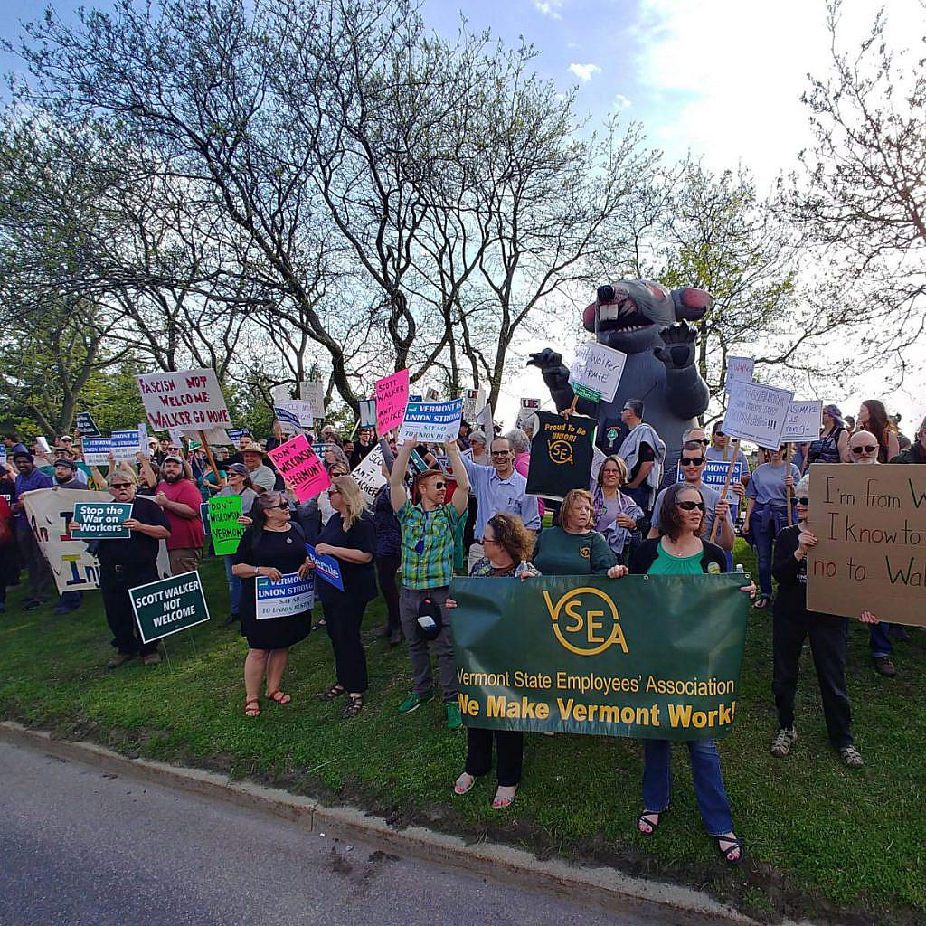 VSEA’s Board of Trustees is thanking all the members and retirees who took time to attend this important demonstration and lend your voice to the hundreds rallying strongly and loudly in opposition to Walker’s visit to Vermont and to his union-busting, anti-worker mindset and record. |