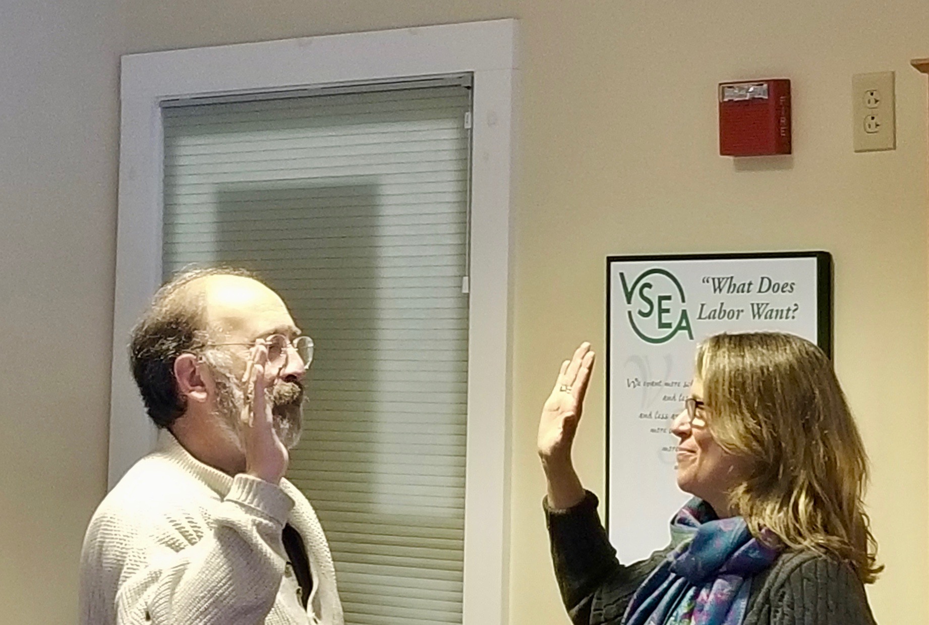 Newly elected VSEA Board of Trustees member Robin Rieske is pictured above being officially sworn into the body by current Board member Bob Hooper, who also serves his union as Retiree Chapter President and who just won election to the Vermont House.