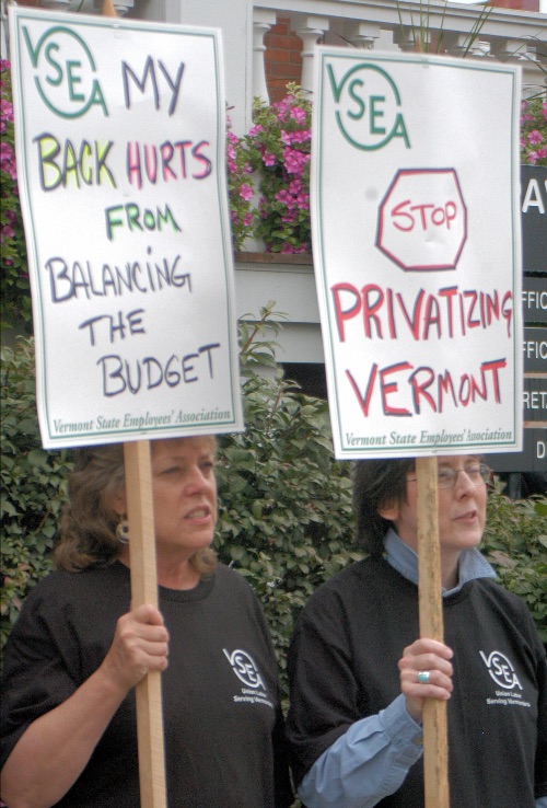 VSEA members Shelley Martin and Sue Baird protest State service and position cuts in 2010. Sadly, some things never change.