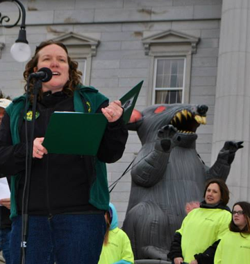 VSEA First Vice President Michelle Salvador served as a co-master of rally ceremonies, hosting alongside the Vermont NEA’s Steve Owens. In her opening remarks to the crowd, Salvador reminded that “state employees are hard-working, middle-class Vermonters too, and we’re here to send a message to [the State] and legislative leaders that we ARE tax payers too and we ARE NOT going to take it anymore…stop the cuts and raise revenue!” The line drew thunderous applause. She also led the crowd in several chants, including, “We’re state employees under attack, what do we do? Rise up! Fight back!”