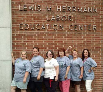 VSEA’s delegation to the 2016 NE Summer School for Women in Unions and Worker Organizations strike a pose on the grounds of the Rutgers campus in New Brunswick. NJ. Pictured here: Melissa Walsh (VVH), Cassidy Renfrew (DOC), Dawn Carillo (DII), Barbara King (VVH), Victoria Thorpe (Judiciary) and Sarah Draper (DCF). Not pictured is Rebecca Trower (Tax Dept.)