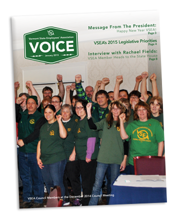 In advance of the 2015 legislative session, VSEA is publishing a special electronic version of the VSEA VOICE, which will be emailed to all members on Monday, January 5. The special edition includes a message from the VSEA President, a breakdown of all the issues that made the 2015 VSEA legislative agenda, an interview with first-time lawmaker and VSEA member Rachael Fields and an interview with DPS worker Patricia Bennett, who testified at the State House for the first time last year and wants to share her positive experience with members who might be wary of coming to Montpelier.