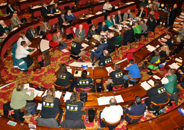 As one television station put it in a headline, “droves” of VSEA 911 dispatchers, Vermont first responders, VSEA members and other supporters filled the House Chambers in Montpelier on March 17. They were there to deliver testimony to the House and Senate Government Operations Committees, opposing the State’s proposed consolidation of four Public Safety Answering Points (a.k.a. 911 Emergency Dispatch Centers) into just two. The evening began with the unrolling of an eight-foot-wide petition bearing the signatures of more than 3,000 Vermonters asking lawmakers not to approve the consolidation. All three Vermont television networks did live remotes from the hearing, and VPR carried a live stream.