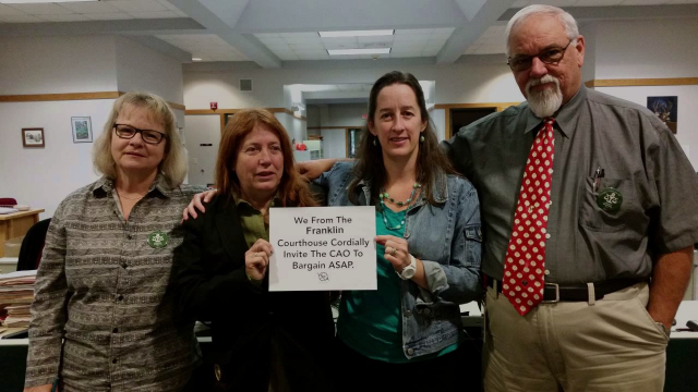 VSEA Judiciary members working in courthouses across Vermont ramped up their efforts this week to get management to come to the bargaining table, after management informed the workers recently that it is unwilling to come to the table until mid-December. Workers had filed an unfair labor practice to try to force management to begin bargaining right now with the Unit, in advance of having to submit a budget to the legislature, but it was recently dismissed by the Labor Board on a technicality. Following the ULP’s dismissal, VSEA members wrote a letter to management, asking them again to come to the table, but the answer they heard back was “not until mid-December.”