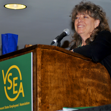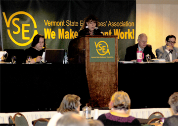 VSEA President Shelley Martin welcomed members to the Annual Meeting and delivered a report on her activities over the past year. Some of the things she highlighted included meeting often with State officials on worksite issues related to lack of staff, too large caseloads, safety and health, the use of temps and private contractors, retaliation and harassment and contract enforcement. Martin also touched on her efforts to visit more worksites personally to talk face-to-face with frontline employees and her desire to begin asking members with specialized interests to take the point for the union on issues like global climate change, global and national economics and, of course, threats and challenges to labor. She summarized how VSEA retirees worked hard to ensure that an EGWP prescription drug plan adopted earlier this year was fair and contained no surprises, and she thanked all VSEA retirees for their help. Martin ended by urging members to continue sharing their cost-savings ideas with VSEA, reminding that Vermont is staring at another large budget deficit and the time is now to begin collecting ways to save the state money. She also asked members to continue educating lawmakers and community members at-large about the essential services being provided daily by VSEA members. Members with cost-savings ideas can send them to VSEA at vsea@vsea.org. Please put “cost-savings’ idea” in the email subject line.